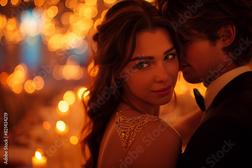 A couple embracing in a candlelit room, with soft music playing and a romantic dinner table set for two, creating an atmosphere of love and intimacy.
