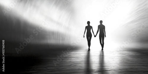A couple walks hand in hand through a bright path. The silhouette stands out against the light background. This image captures love and connection in a minimalist style. AI