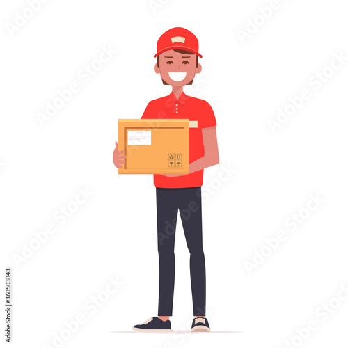 A courier in red uniform with the parcel. Vector illustration isolated on white