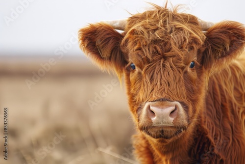 A cow with a blue eye stares at the camera. The cow is brown and has a white nose