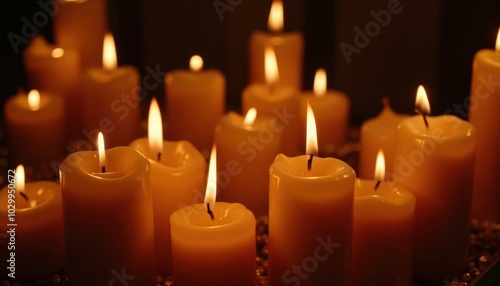 A cozy arrangement of lit yellow candles creating a warm, inviting atmosphere in a dimly lit setting.