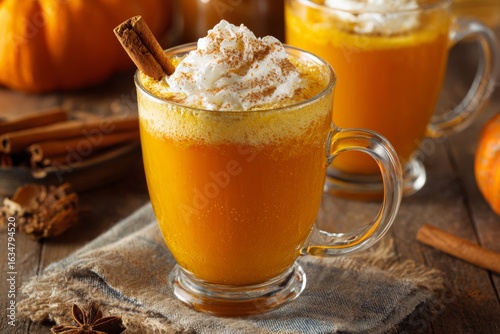 A cozy autumn setting features a warm pumpkin spice drink topped with whipped cream and cinnamon. The vibrant orange color brings seasonal cheer. Perfect for chilly evenings