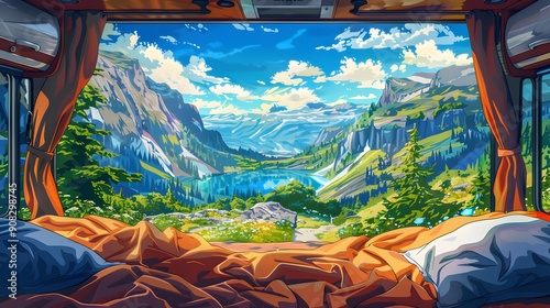 A cozy bedroom with a view of a serene lake and mountains, sunlight streaming in, inviting relaxation.