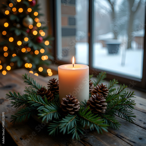A cozy candlelit scene with pinecones and christmas tree in a snowy winter environment, photography of still life concept.