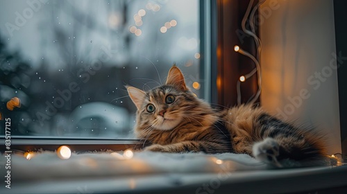 A cozy cat resting on a window ledge surrounded by twinkling fairy lights during a winter evening, creating a warm and festive atmosphere.