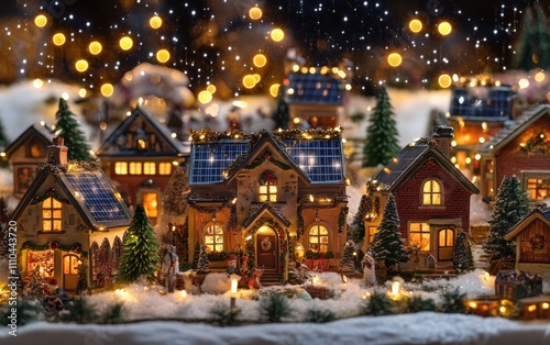 A cozy Christmas village with solar-powered houses decorated with festive lights and garlands under a starry winter sky vibrant and warm atmosphere