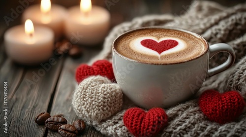 A cozy cup of coffee topped with a heart design, surrounded by love-themed decorations and soft candlelight, creating a warm, romantic atmosphere.