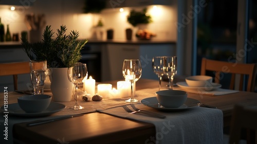 A cozy dining table set for an intimate candlelit dinner, adorned with elegant glassware and soft lighting that creates a warm and inviting ambiance.