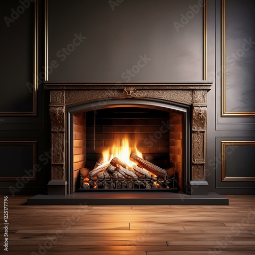 A cozy fireplace features a lively fire with glowing logs and a sophisticated mantel. The rich wood floor and elegant wall details enhance the inviting atmosphere of the room