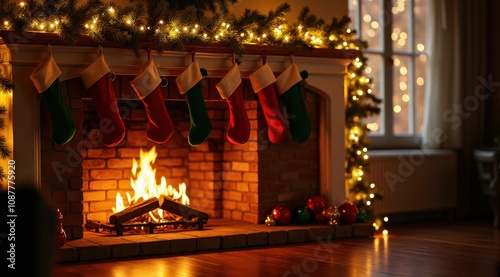 A cozy holiday scene with stockings hanging on a fireplace mantle, surrounded by festive decorations