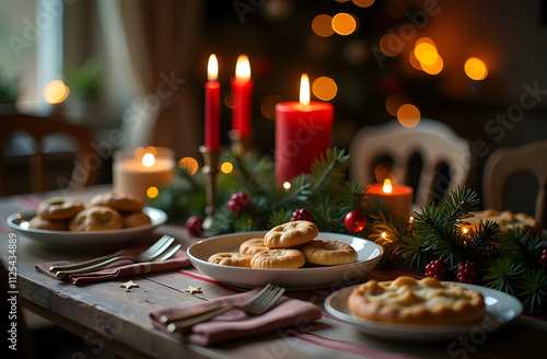 A cozy holiday table is elegantly decorated with pine branches and flickering red candles