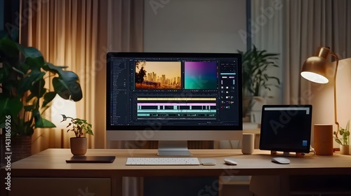 A cozy home office at night, featuring a desktop computer displaying video editing software. Plants and a desk lamp add to the ambiance. Perfect for productivity and creativity.