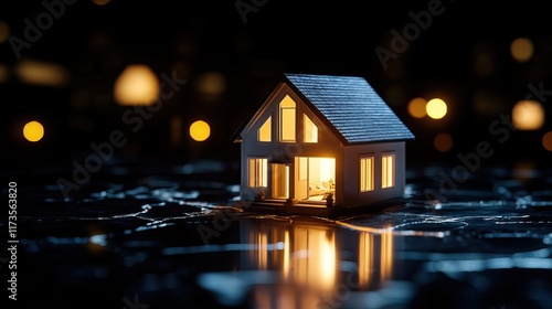 A cozy, illuminated miniature house sits on a reflective surface, surrounded by soft bokeh lights, creating a warm, inviting atmosphere.