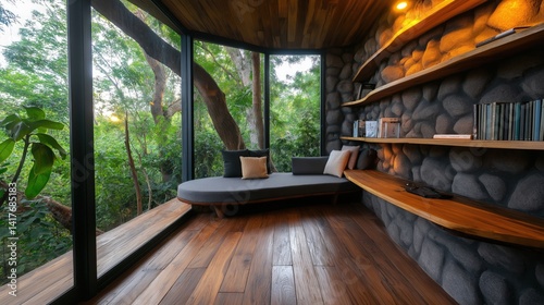 A cozy interior featuring natural materials, large windows, and views of greenery, creating a tranquil reading or relaxation space.