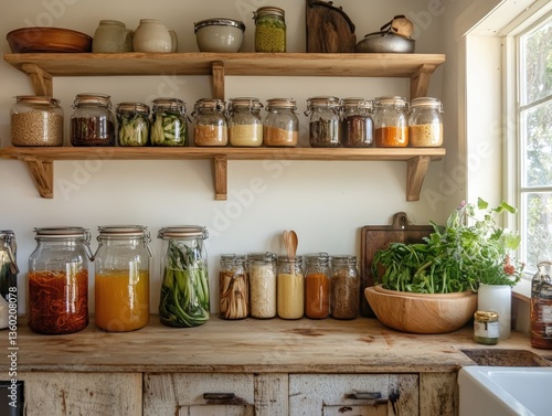 A cozy kitchen with homemade kombucha, sourdough bread, and fermented vegetables
