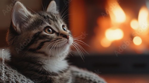 A cozy kitten gazes curiously at a flickering fireplace, radiating warmth and comfort in a serene setting.