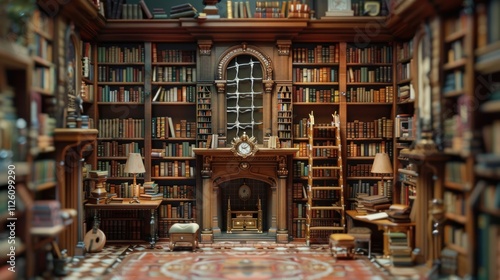 A cozy library filled with books, a fireplace, and a warm ambiance.