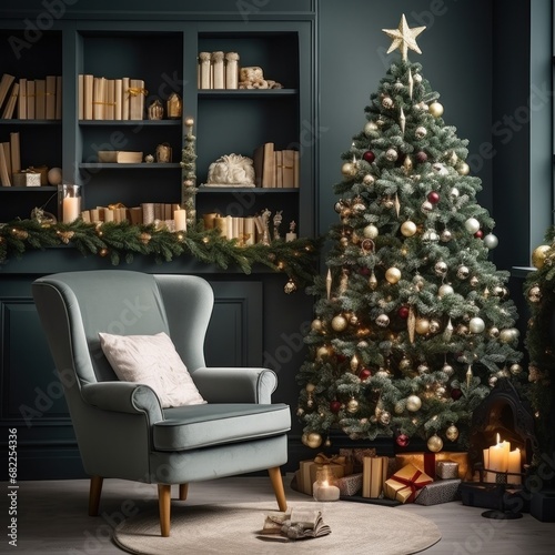 A cozy living room with a decorated Christmas tree and a comfortable armchair