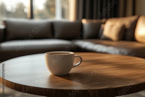 A cozy living room with a round wooden table in the foreground and an elegant leather sofa in the background