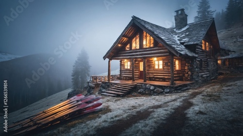A cozy log cabin in a misty landscape, illuminated warmly at dusk.