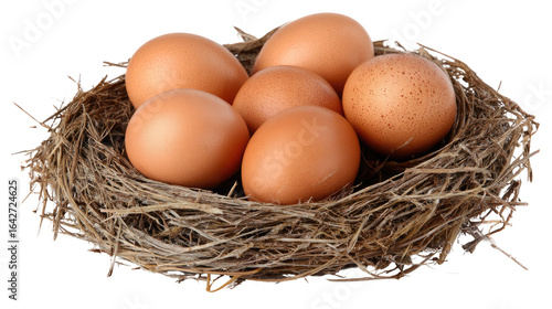 A cozy nest filled with brown eggs, symbolizing new beginnings and fertility. Perfect for themes related to nature, farming, and the comfort of the outdoors.