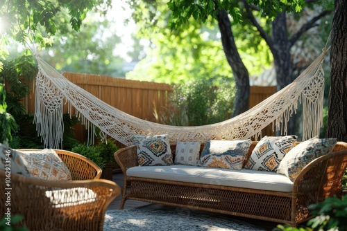 A cozy outdoor seating area featuring a stylish hammock, comfortable sofa, and lush greenery, perfect for relaxation and enjoying nature.
