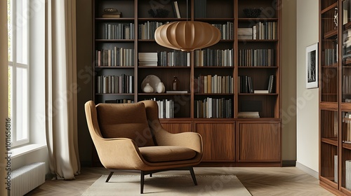 A cozy reading nook with a brown armchair, a large bookcase filled with books, and a round pendant lamp hanging from the ceiling.