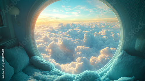 A cozy room features a round window showcasing a breathtaking view of clouds and a colorful sky during sunset.