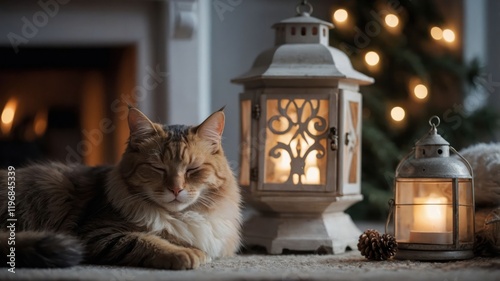 A cozy scene featuring a sleeping cat beside decorative lanterns and a warm ambiance.