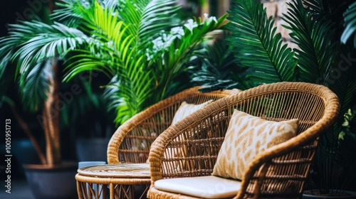 A cozy seating area surrounded by lush greenery, perfect for relaxation.