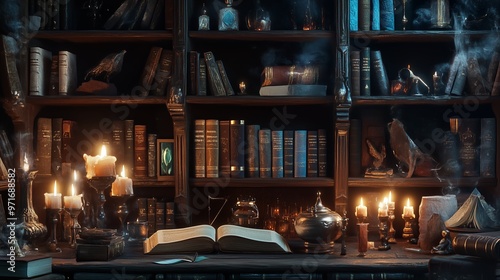 A cozy study filled with ancient books, flickering candles, and mystical artifacts in a dimly lit room at night