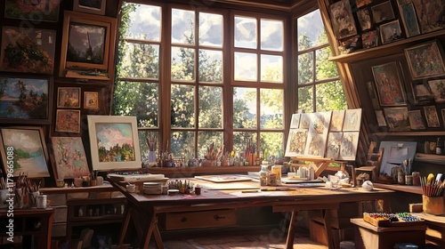 A cozy workshop table filled with paints, brushes, and small art canvases