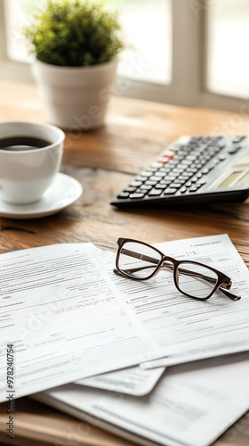 A cozy workspace with documents, glasses, and a cup of coffee on a wooden table, exuding productivity and comfort.