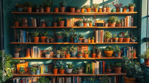 A cozy, zoomed-in view of numerous shelves filled with books and succulents, set in a warm, bright interior.