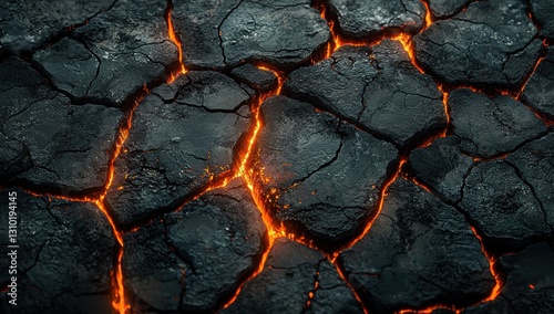 A cracked black volcanic rock surface with glowing lava fissures creating a fiery molten texture intense heat radiates from deep glowing orange veins forming a dynamic geological eruption background