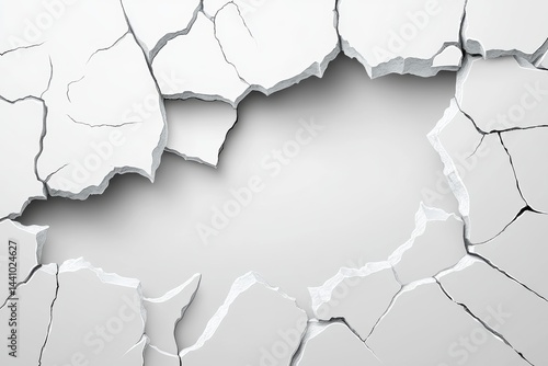 A cracked concrete wall texture is depicted in this modern and realistic illustration of the effects of an earthquake, showcasing an abstract black hole in a cement wall, which can be used as a
