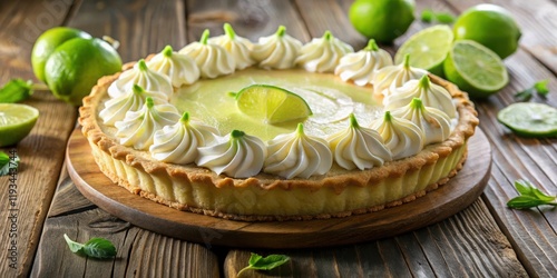 A creamy lime pie with a flaky crust, topped with swirls of whipped cream and a slice of lime, rests on a rustic wooden surface, surrounded by fresh lime wedges and sprigs of mint.
