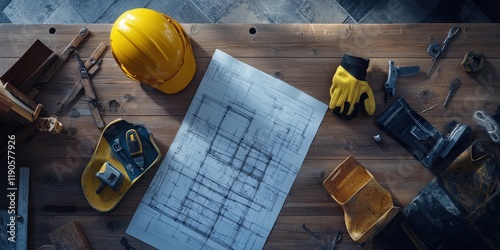 A creative flat lay of scaffolding blueprints, safety helmets, and gloves on a workbench
