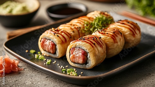 A creative food styling concept where pigs in a blanket are plated like sushi rolls, served with wasabi mustard and soy sauce