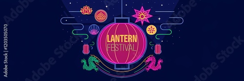 A creative minimalist lantern festival poster design with a neon theme. The main element is a large lantern with the text "Lantern Festival". There are smaller lanterns with various patterns