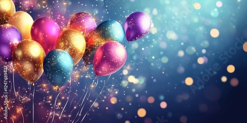 A creative party-themed background with balloons, sparkles, and celebratory text