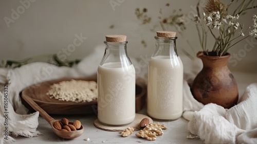 A creative showcase of nut milks in frosted glass bottles, styled with natural fibers and earthy tones.
