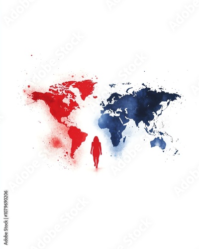 A creative watercolor map representation showcasing two sides of the world, uniting colors and a figure in contemplation.