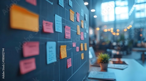 A creative workspace featuring a board with colorful sticky notes, illuminating brainstorming and project planning in a modern office environment.