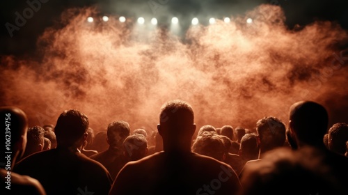 A crowd gazes intently at a stage shrouded in smoke, illuminated by thrilling lights from above, anticipation palpable as they await the spectacle to begin.