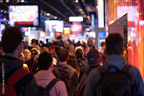 A crowd of anonymous people gathers at a trade fair, bustling with activity