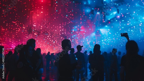 A crowd of people gathered together, looking up at a colorful firework display in the night sky.