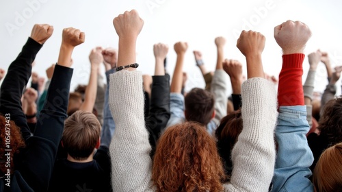 A crowd of people raise their fists in the air as a gesture of solidarity and unity, symbolizing strength and collective action against a light backdrop.