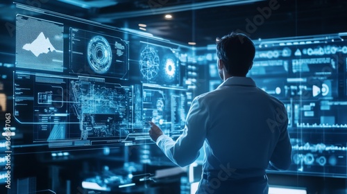 A cryptocurrency expert creating AI powered decentralized platforms for blockchain based crypto backed decentralized travel booking systems, futuristic travel lab with live data, High-tech style