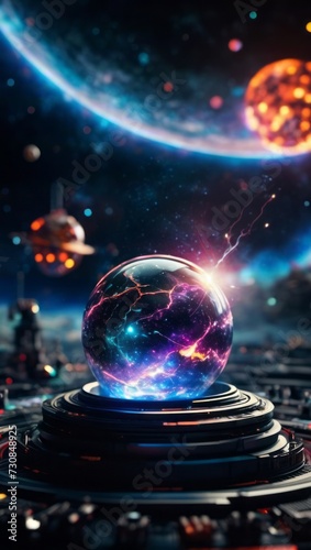 A crystal ball with colorful lightning crackling within, sits atop a black platform. In the background, there are ships and a planet with a ringed atmosphere.